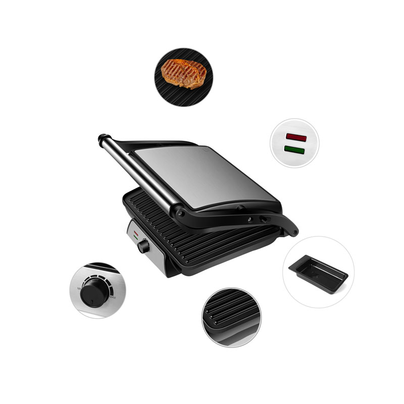 | คุณสมบัติ | ด้ามจับที่ปลอดภัยแบบสัมผัสเย็น ถาดรองน้ำหยดสำหรับกักเก็บน้ำมันส่วนเกิน ปุ่มควบคุมอุณหภูมิแบบปรับได้ เคลือบสารกันติดเพื่อทำความสะอาดง่าย ระบบบานพับแบบลอยตัวจะปรับตามขนาดของขนมปัง เนื้อสัตว์ หรือของว่างโดยอัตโนมัติ สามารถเปิดได้ 180° แบบตะแกรงเปิด เปิดเครื่องและไฟพร้อมทำงาน ขาตั้งกันลื่น |